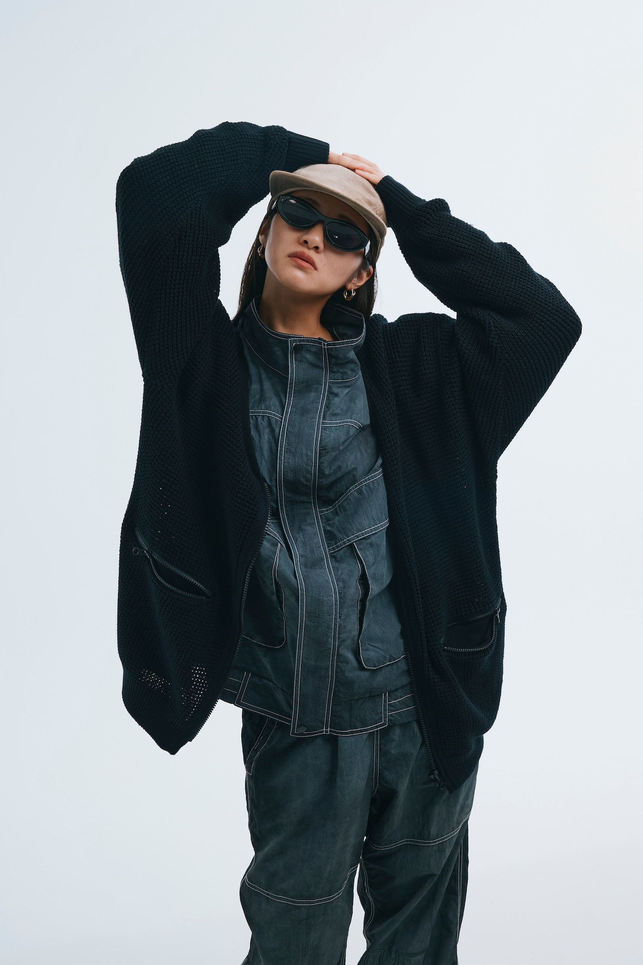 フロントとポケット部分にジップを施し、機能性とデザイン性を両立。アームとボディにとゆとりを持たせ、自然な“たるみ”が生まれる独特のシルエットに仕上げました。ポケットにはラバーパッチを施し、さりげないアクセントとなっております。