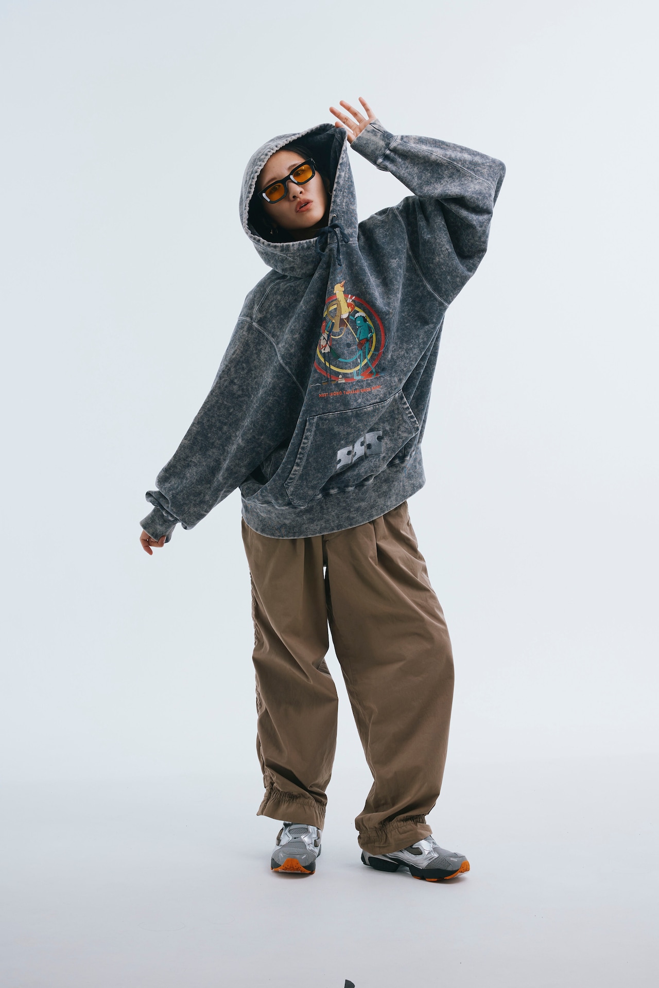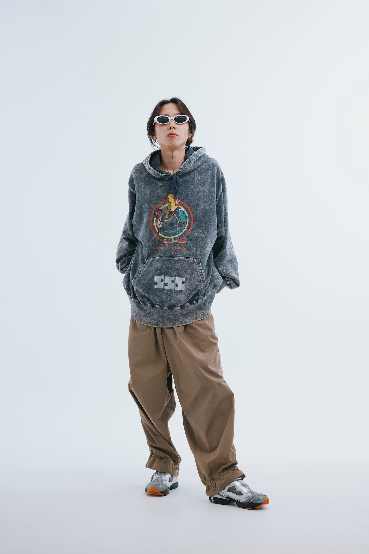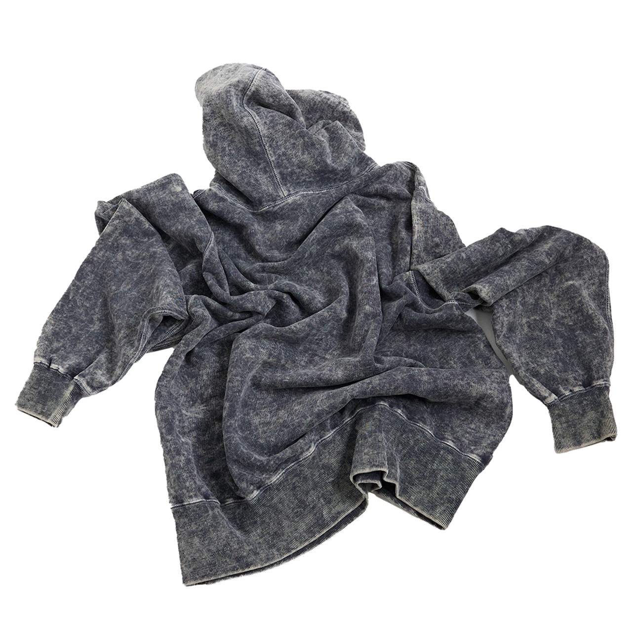 ピグメント加工でムラのある表情を出した上からプリントを重ね、奥行きのあるグラフィックに仕上げたプルオーバーフーディー。