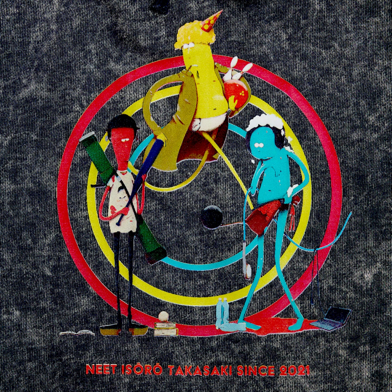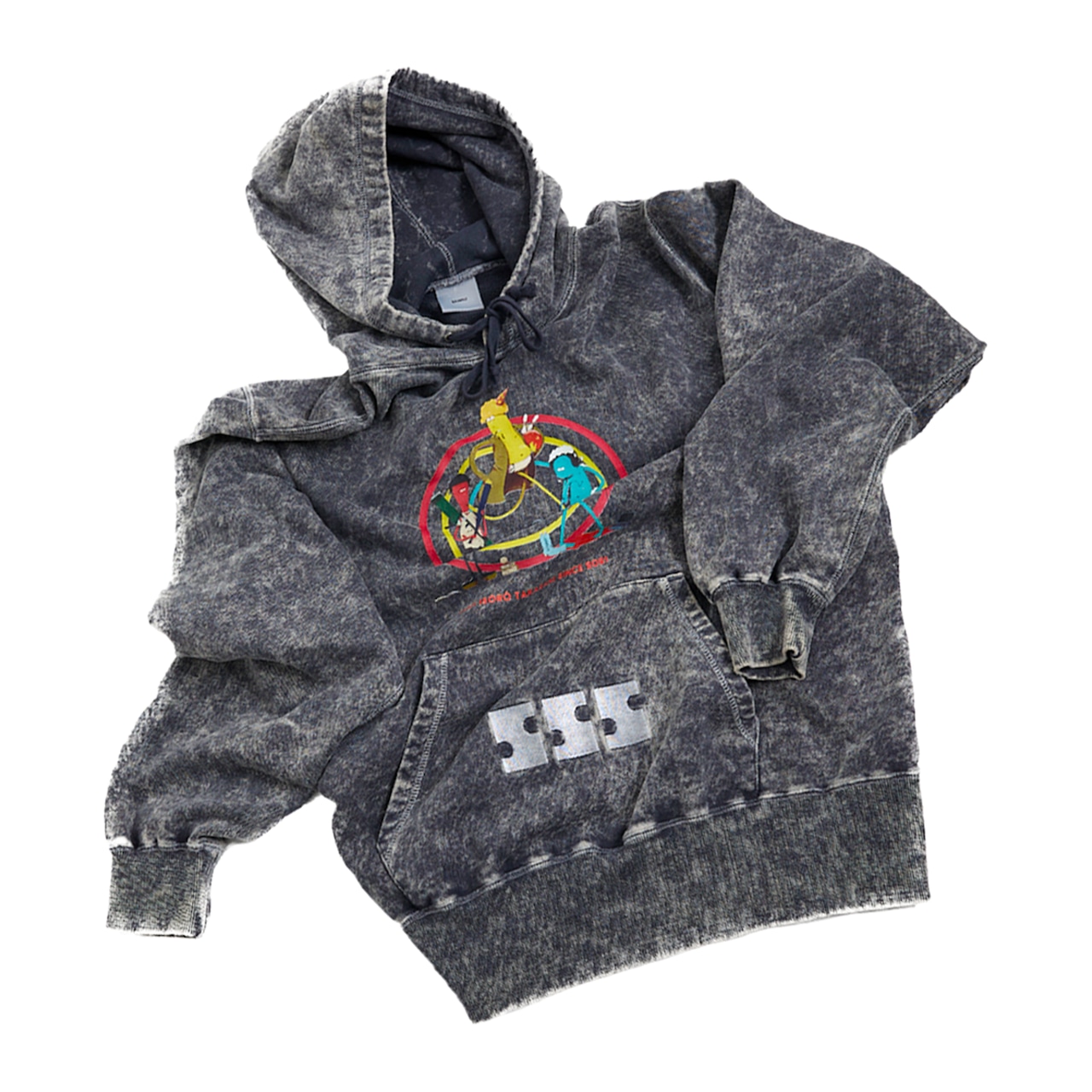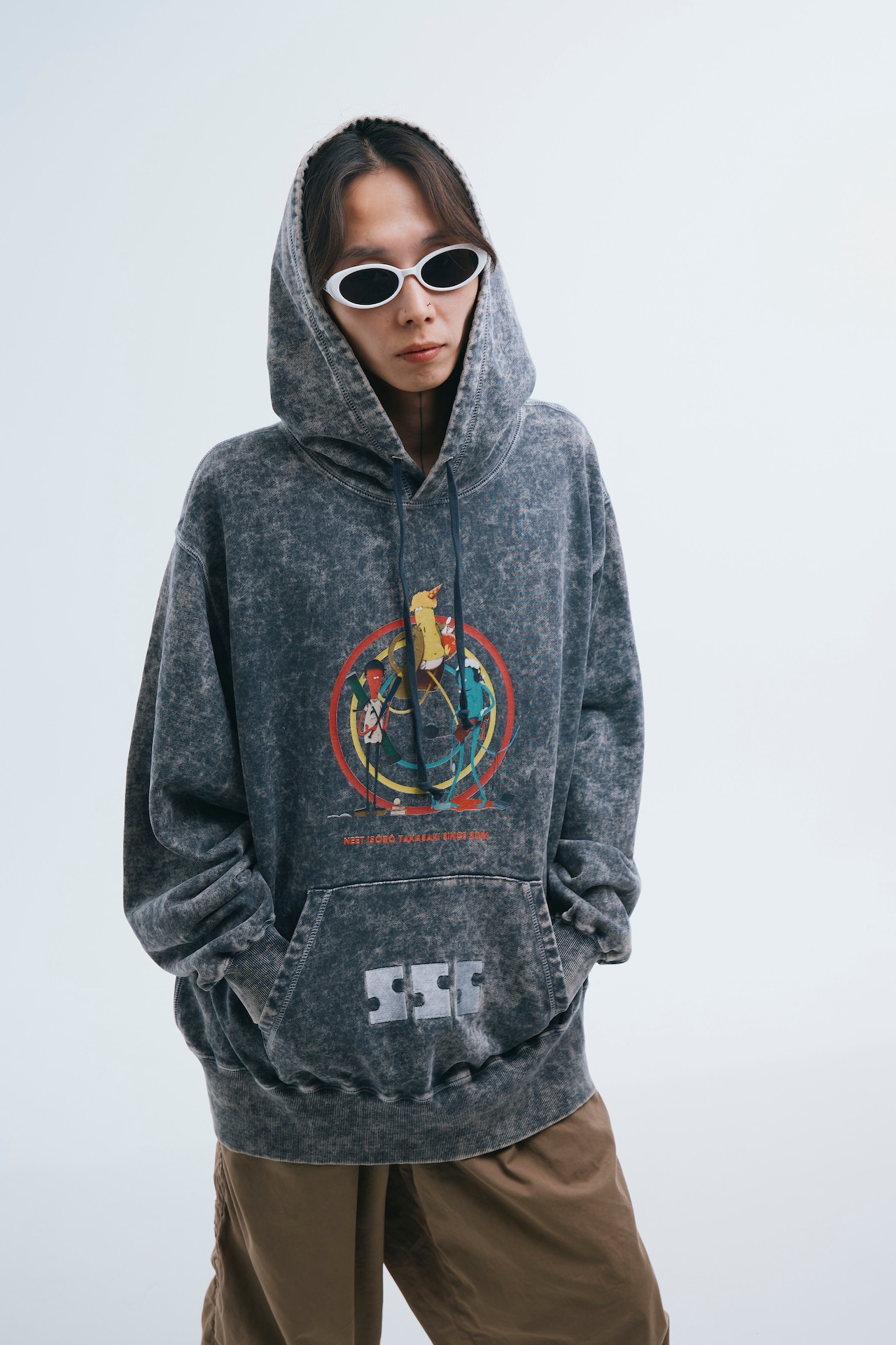 ピグメント加工でムラのある表情を出した上からプリントを重ね、奥行きのあるグラフィックに仕上げたプルオーバーフーディー。