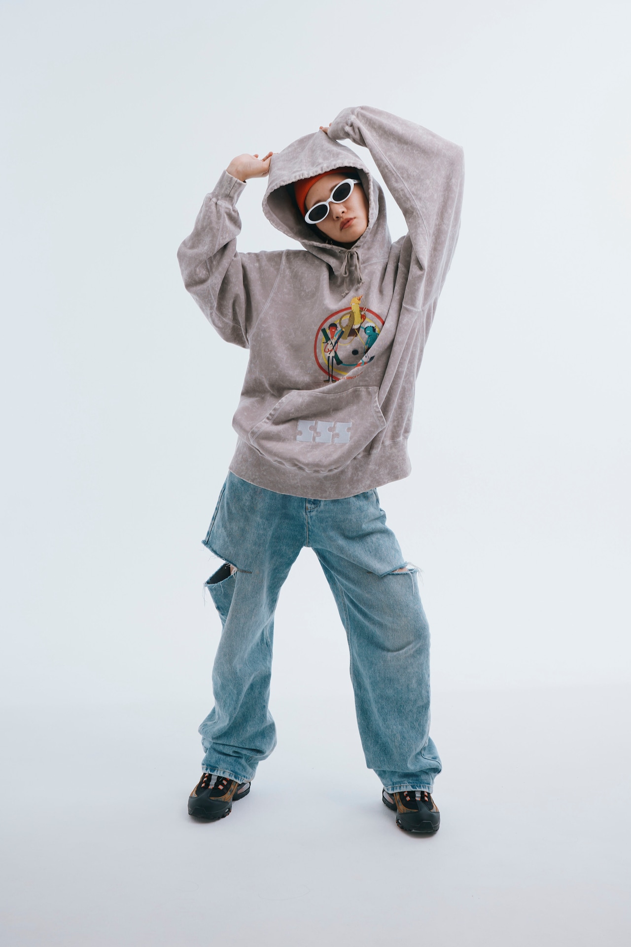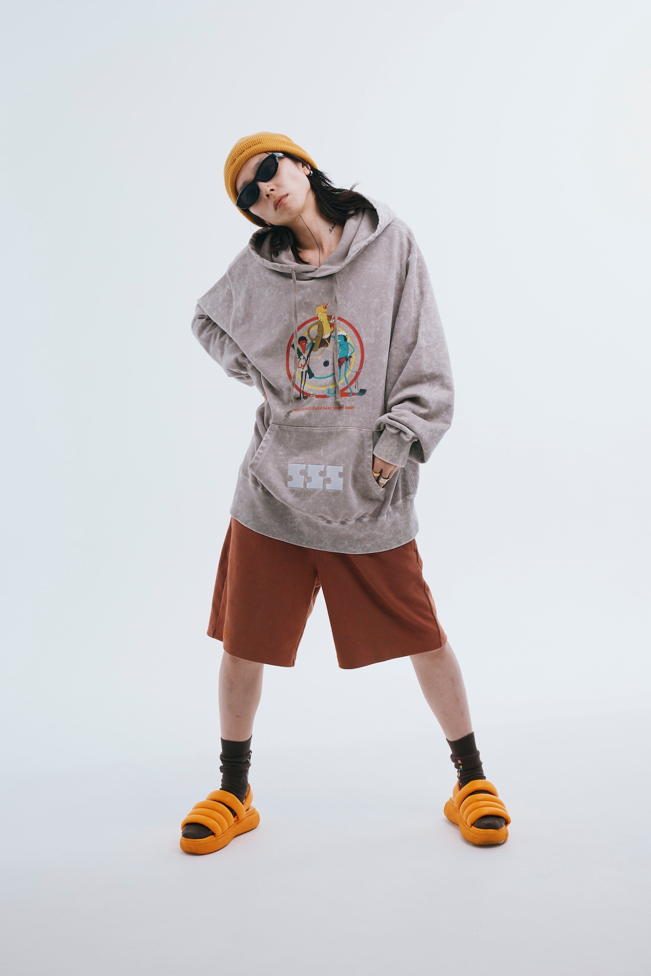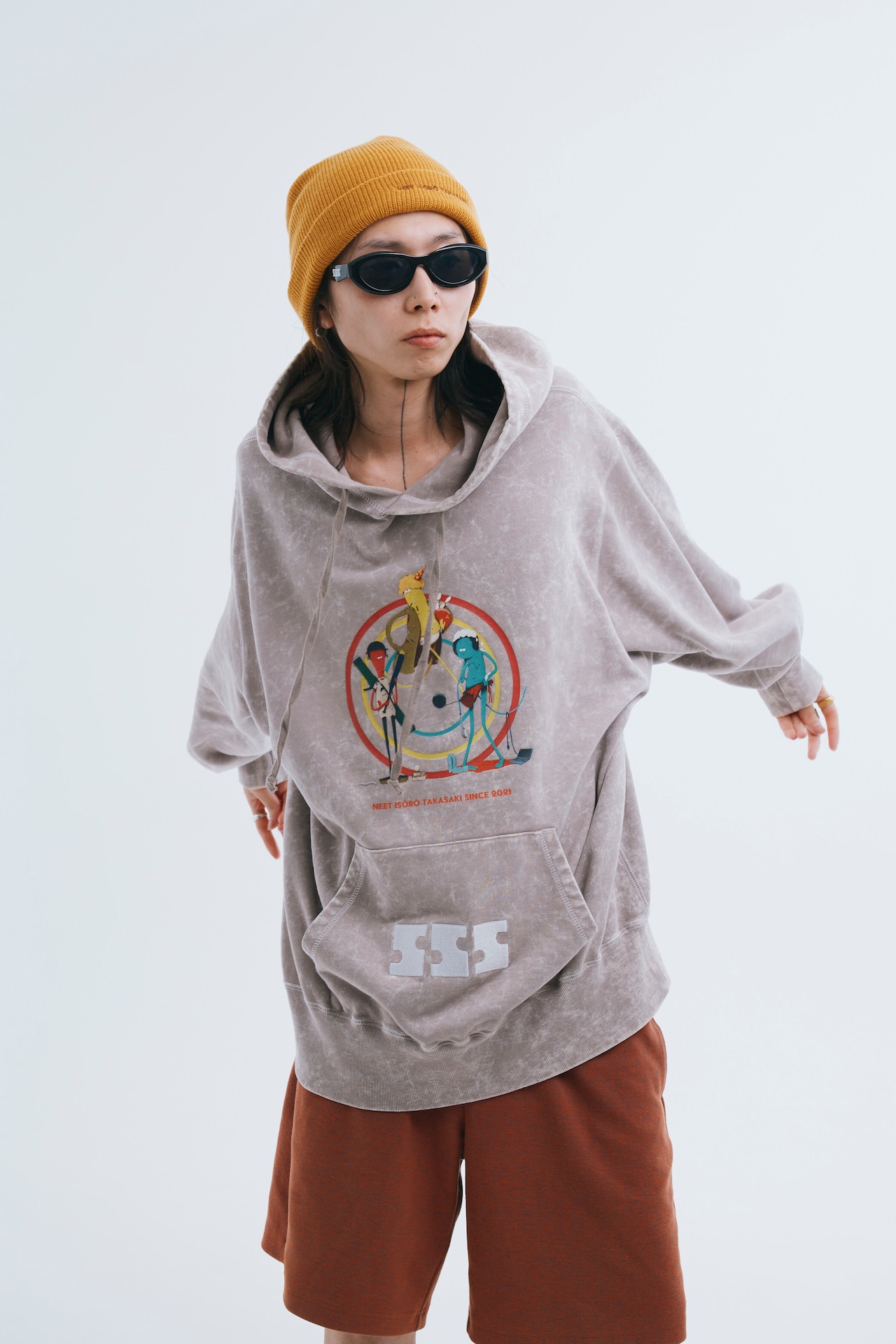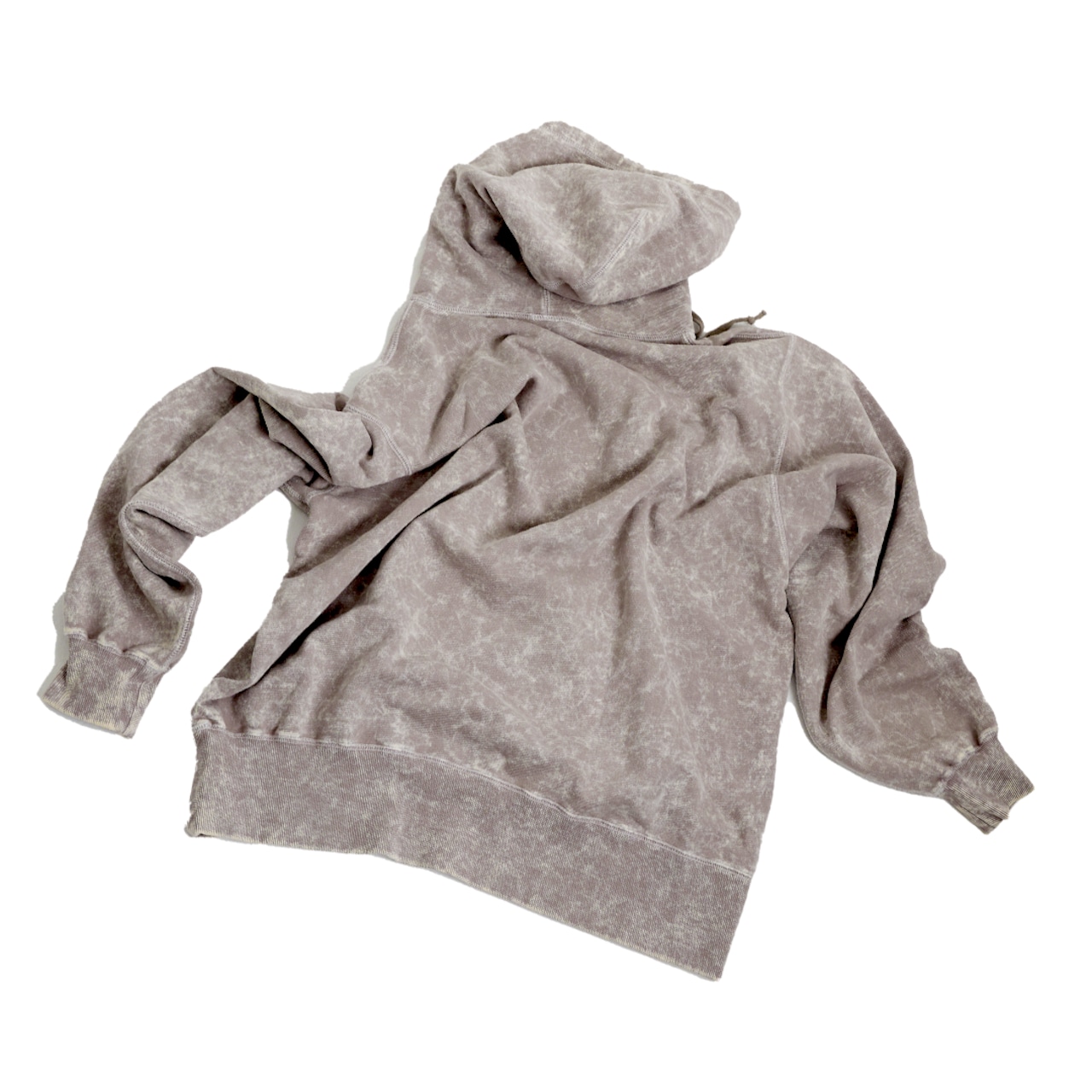 ピグメント加工でムラのある表情を出した上からプリントを重ね、奥行きのあるグラフィックに仕上げたプルオーバーフーディー。