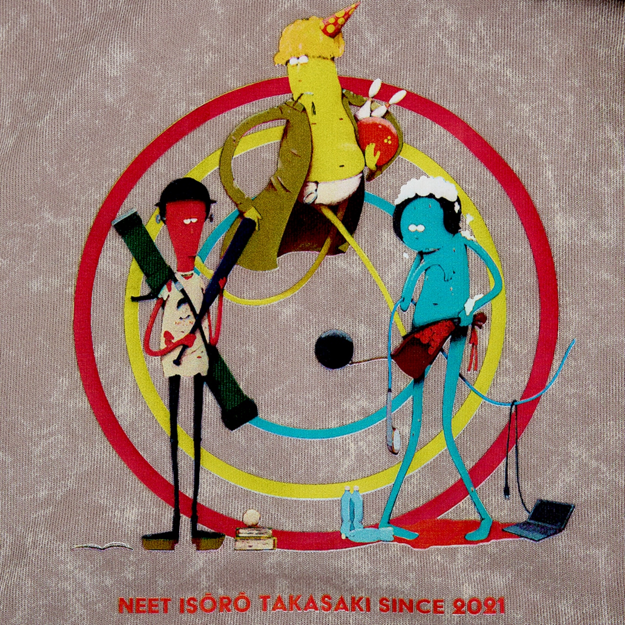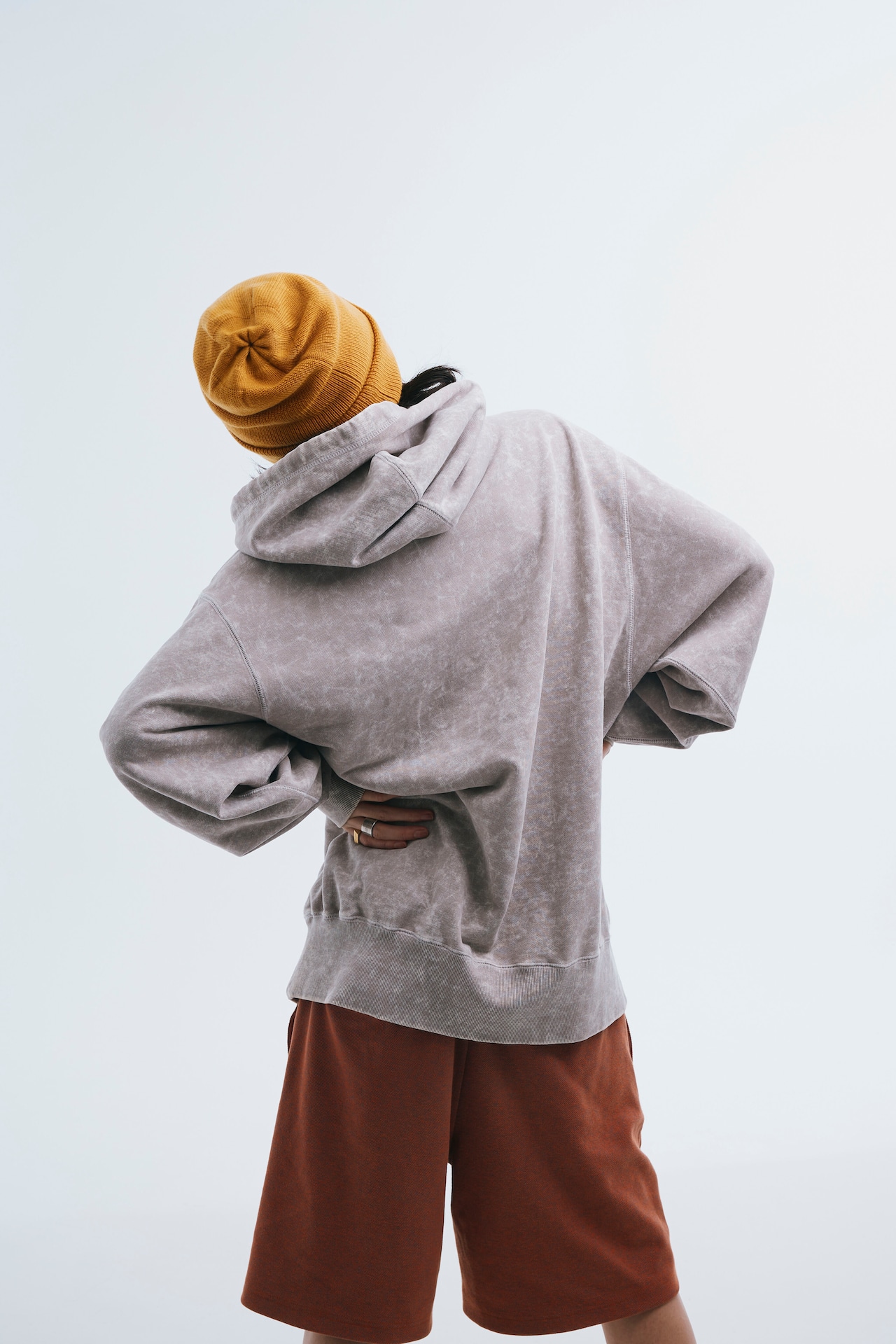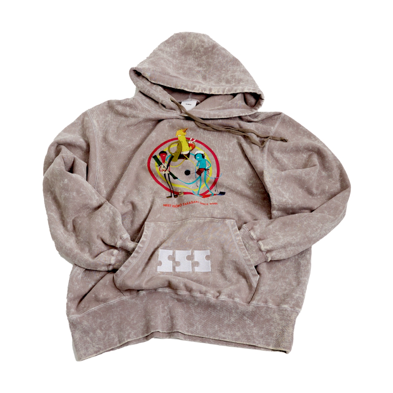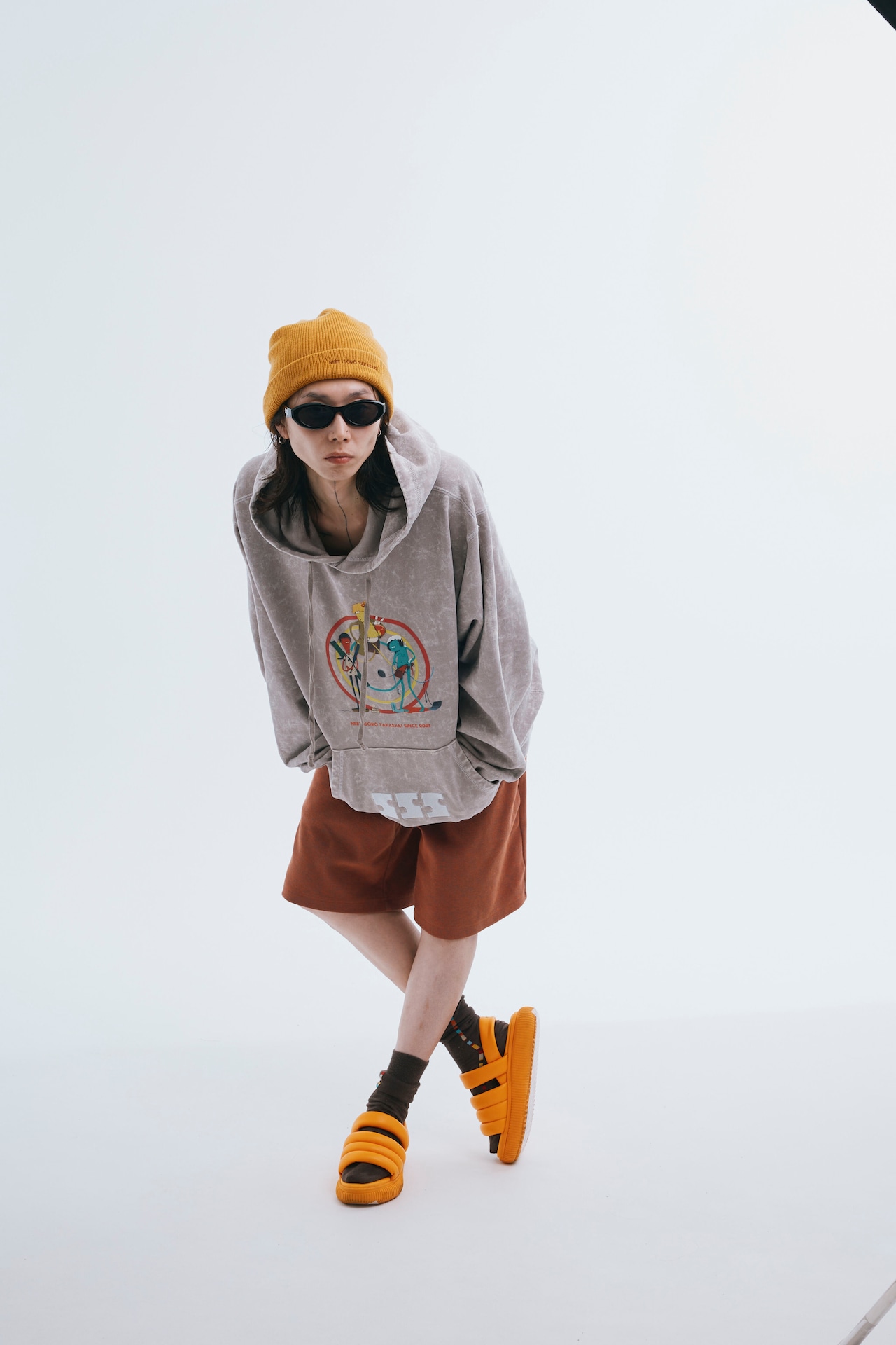 ピグメント加工でムラのある表情を出した上からプリントを重ね、奥行きのあるグラフィックに仕上げたプルオーバーフーディー。