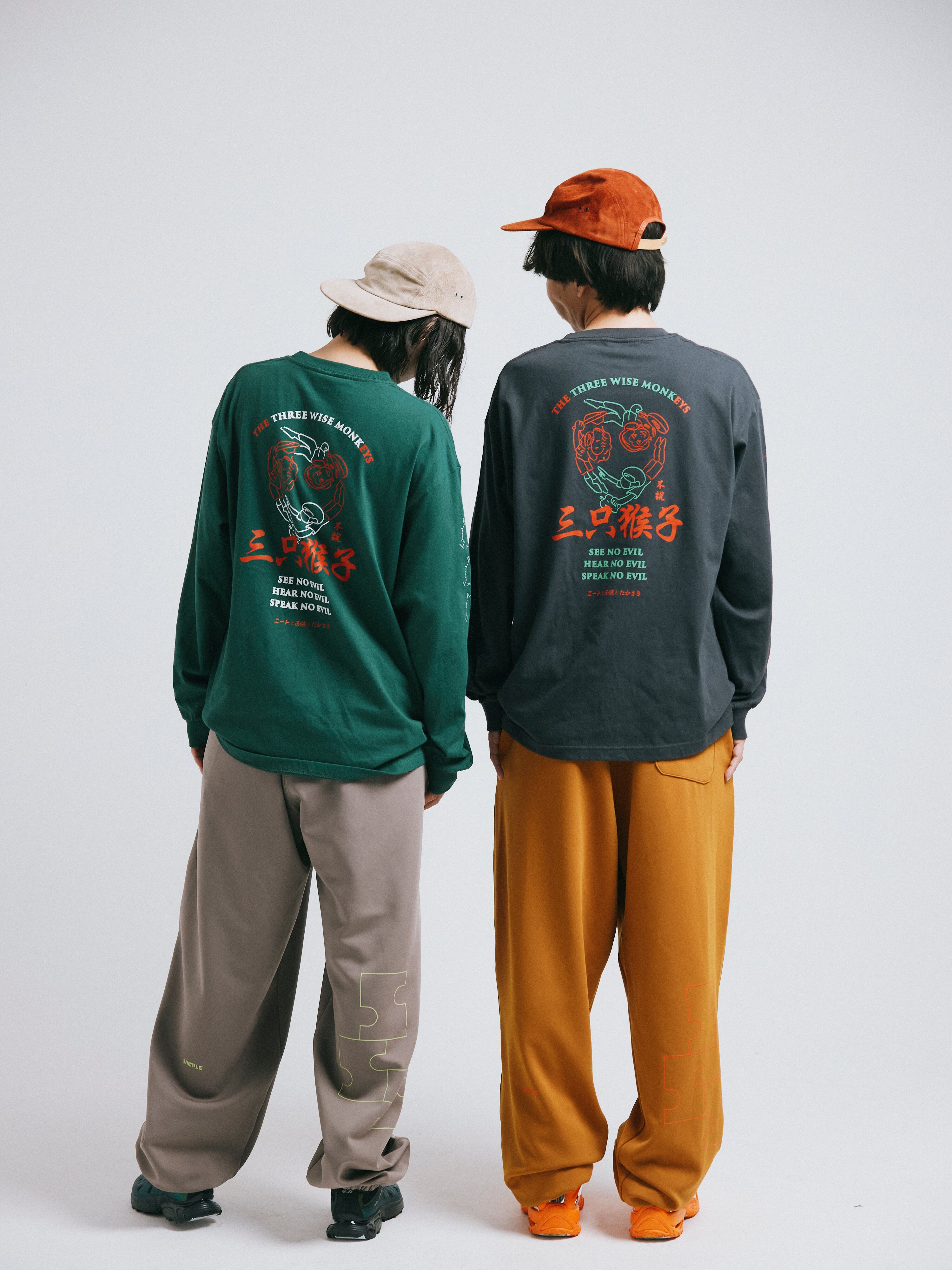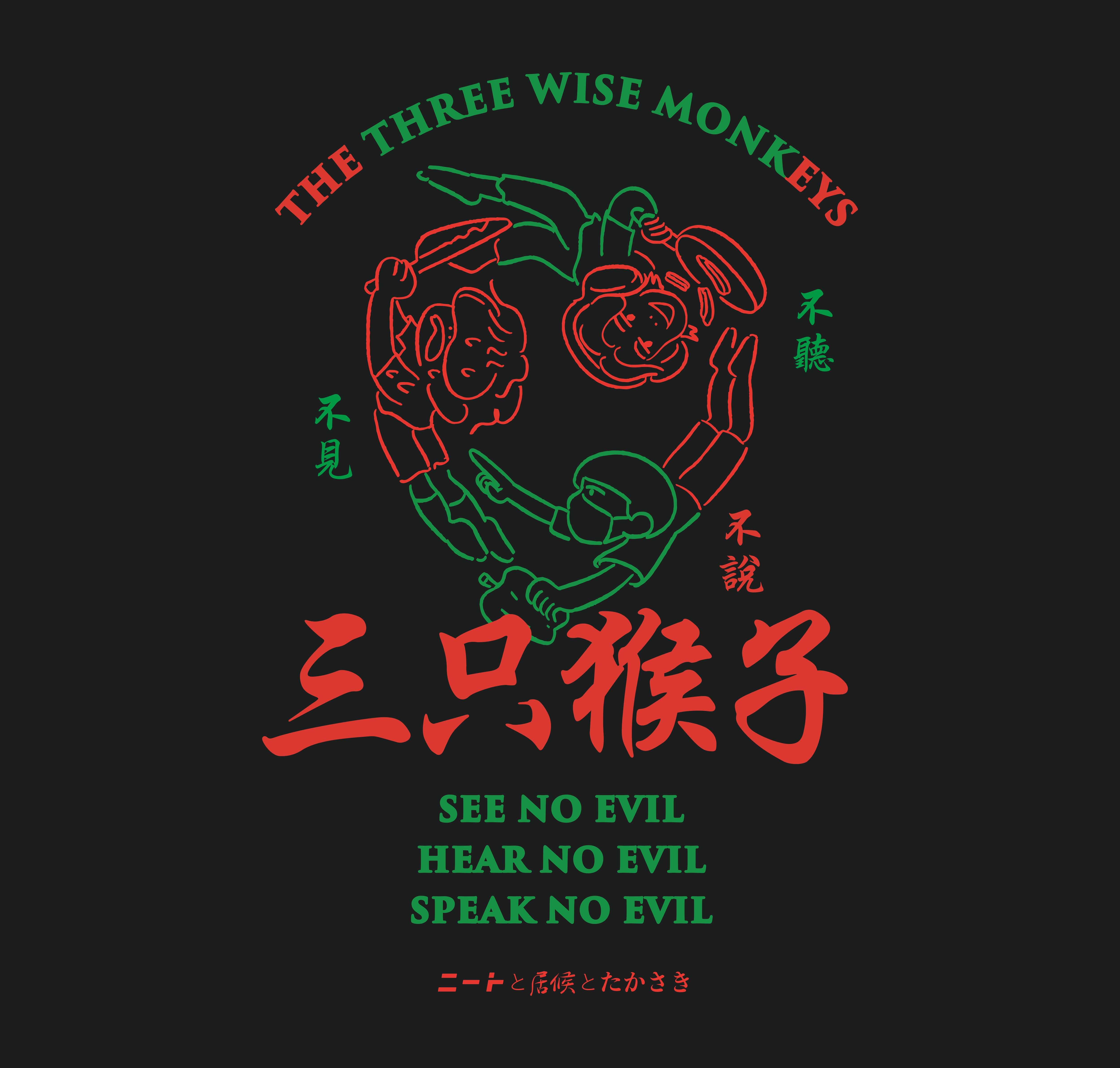 フロントに三猿、バックには中華イメージの三猿イラスト、アームにはニートと居候とたかさきの英語をプリントしました。